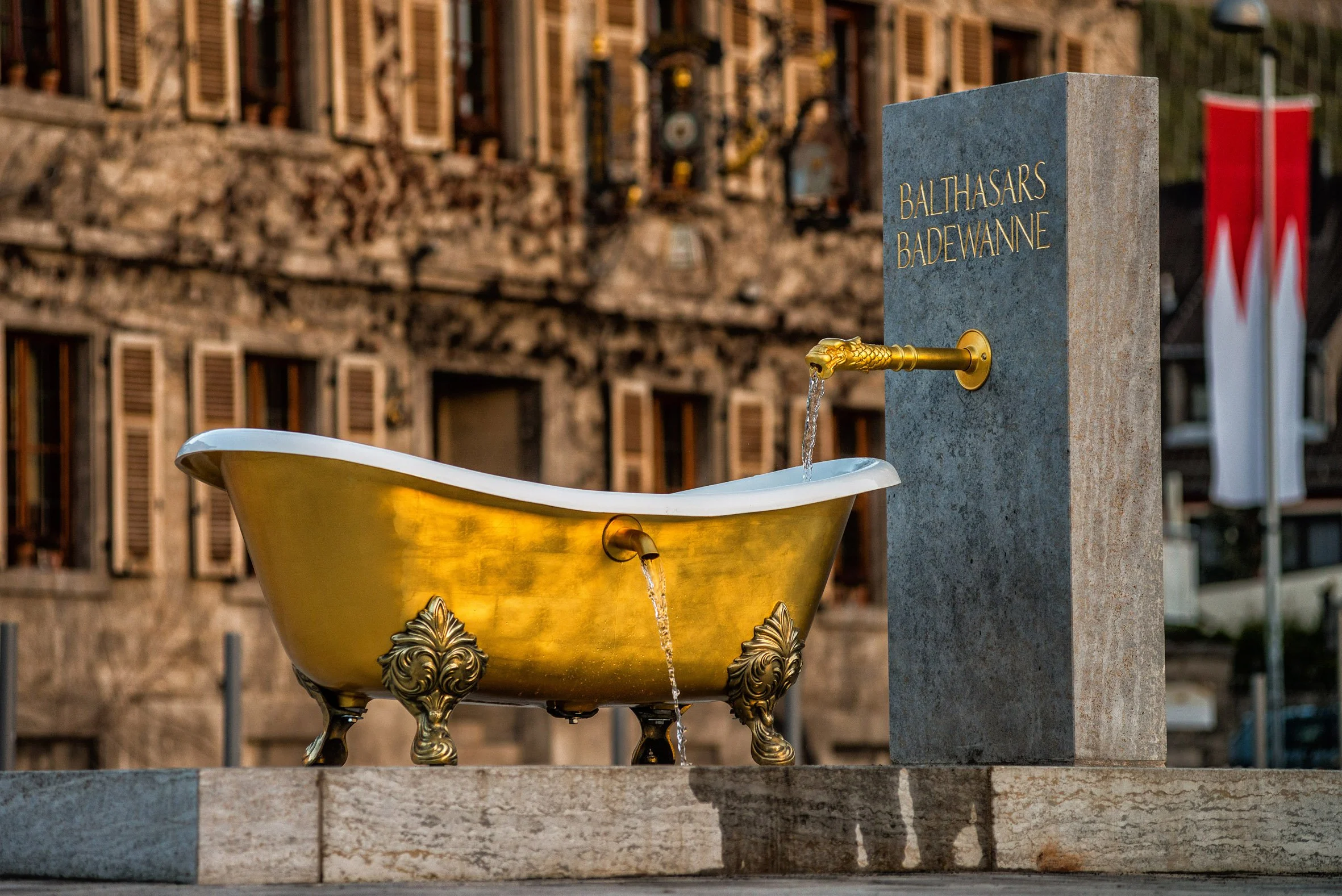 Natürlich ist dies mit einem Augenzwinkern zu sehen, aber durch „Balthasars Badewanne“ wird der Besucher auf den historischen Pavillon Neumanns hingewiesen, der sonst im Vorbeifahren auch schnell mal übersehen wird. Die Brunnenanlage ist durch die goldene Farbgebung schon von weitem auf dem Platz gut sichtbar und wirkt wie ein kleines Wahrzeichen, das die Menschen anziehen wird.